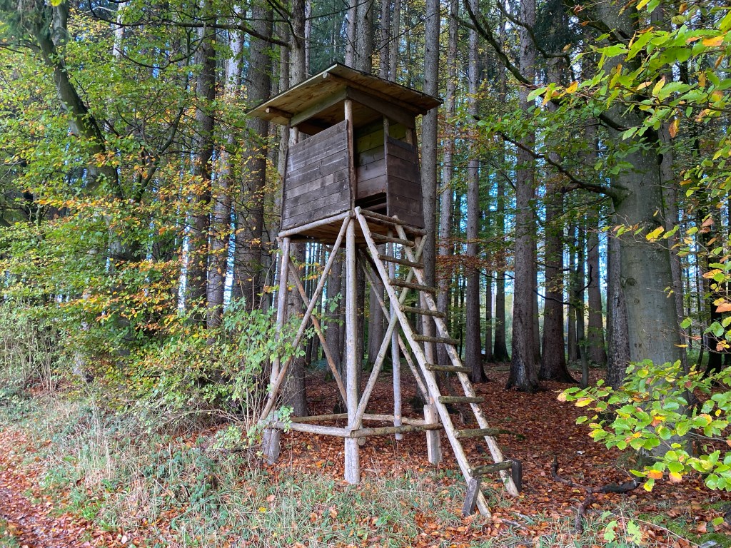 I’ve been hiking these days in the forests and farmland around Munich. At the edge of many patches of forest sits a a wooden treestand, like this.